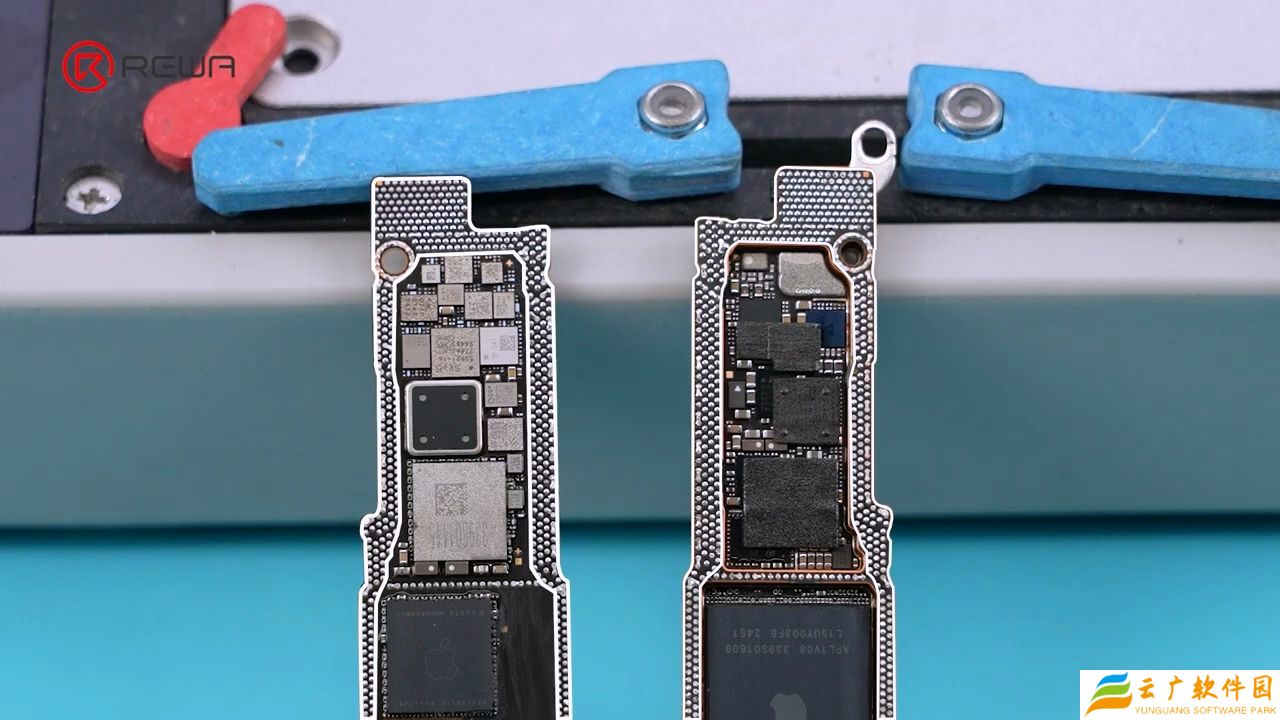 拆解视频还展示了 iPhone 16e 的逻辑板,包括 A18 芯片和苹果定制设计的 C1 蜂窝基带。视频指出,A18 芯片的移除难度更大,因此维修难度也会更高。