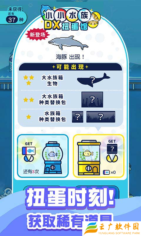 觉得当前养殖的鱼类比较少怎么办,那就试一下扭蛋馆吧,只要用你的小手轻轻点击以下扭蛋馆,就能从中获取不同的鱼类或者是稀有的道具,像海豚这种高级鱼类就能从扭蛋馆中抽取哦,除了扭蛋馆以外,玩家还可以通过海钓来获得更加珍惜的鱼种。