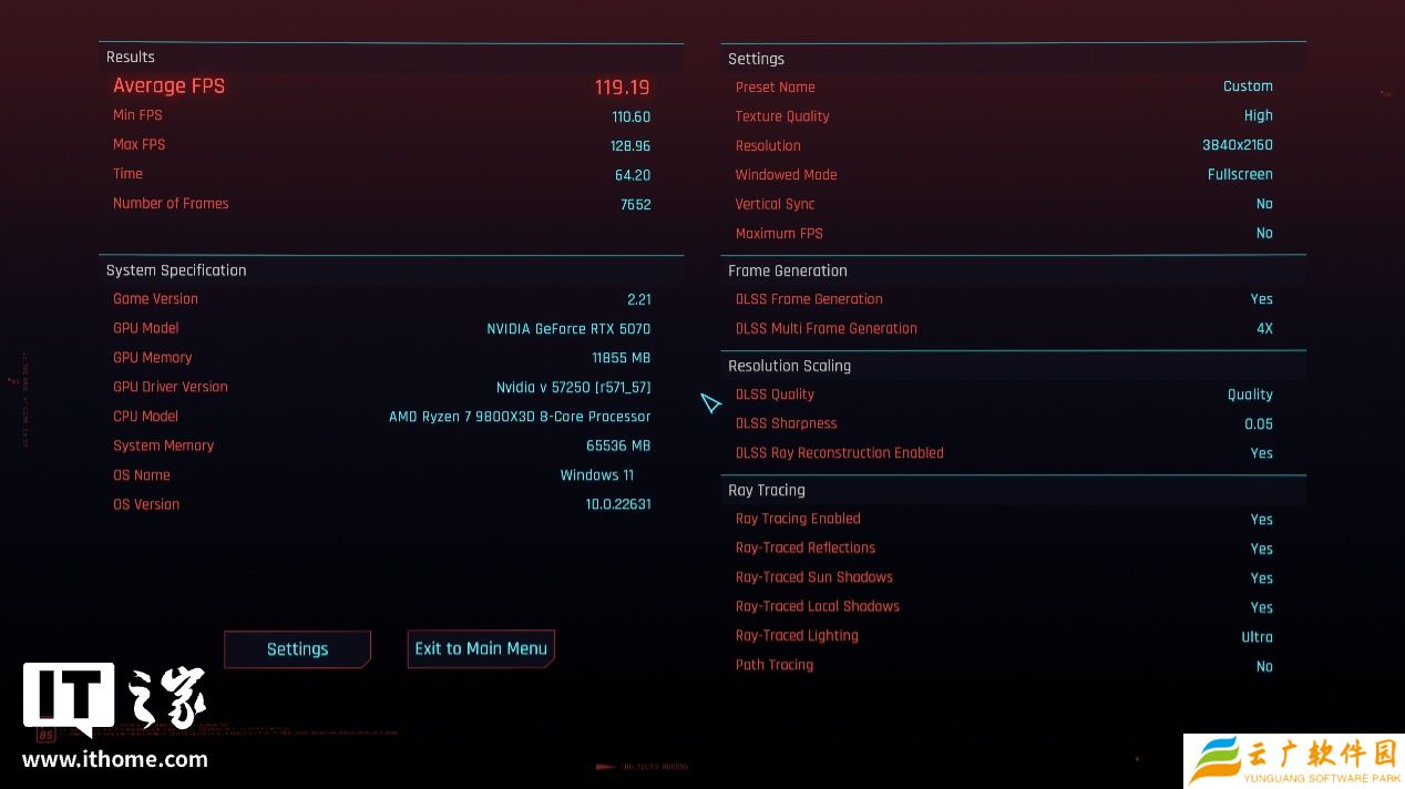 幸好显卡支持 DLSS 4 技术,在游戏中开启 DLSS Multi Frame Generation(DLSS 多帧生成)选项后,游戏帧数的表现瞬间就不一样了。我们依次在 4K 分辨率 + 超级光追画质 + DLSS 质量档设置下,选择 2x、3x 和 4x 多帧生成,运行游戏基准测试,分别得到了 67 帧、94 帧和 119 帧的游戏平均帧数,相比不开 DLSS 时的 21 帧,提升幅度分别达到了 3.19 倍,4.47 倍和 5.66 倍,原本完全无法在 4K 分辨率下畅玩,现在直接可以跑到 4K / 120Hz 了,不得不说 DLSS 4 给了 NVIDIA GeForce RTX 5070 这张显卡在光追游戏上脱胎换骨的体验。