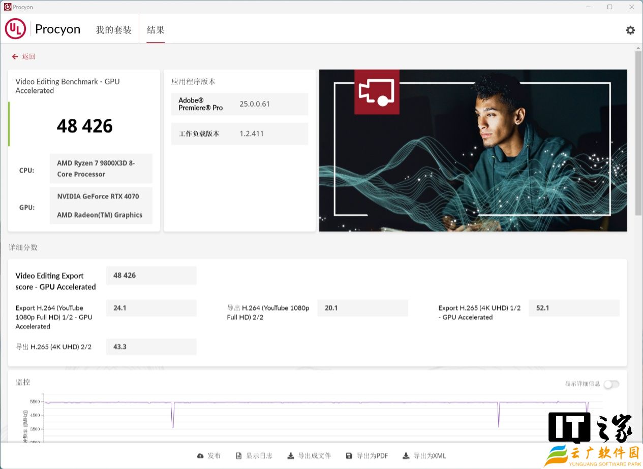 在 UL Procyon 的视频剪辑性能测试项目中,GPU 加速,得益于 Blackwell 架构升级的第九代 NVENC 编码器和 NVDEC 解码器,其在 H.264 / H.265 4:2:2 编码的 8 位和 10 位视频上有着非常大的优势,经过实测:
