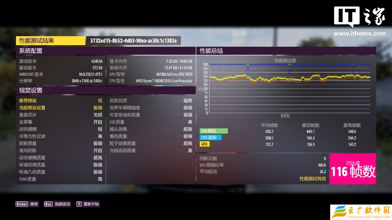RTX 5070 在 4K 分辨率 + 极端画质下,游戏平均帧数为 116 帧,1% Low 帧 100 帧;
