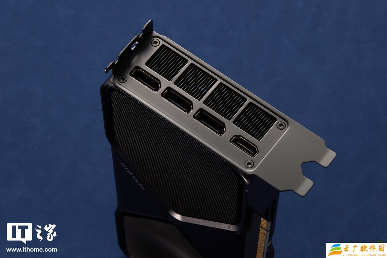 最左侧 I/O 接口的金属挡板上,配备了 3 个 DP2.1b 接口和 1 个 HDMI2.1b 接口,最高支持 8K / 165Hz 视频输出。接口下方对应四个方形散热开孔,排列非常规整。