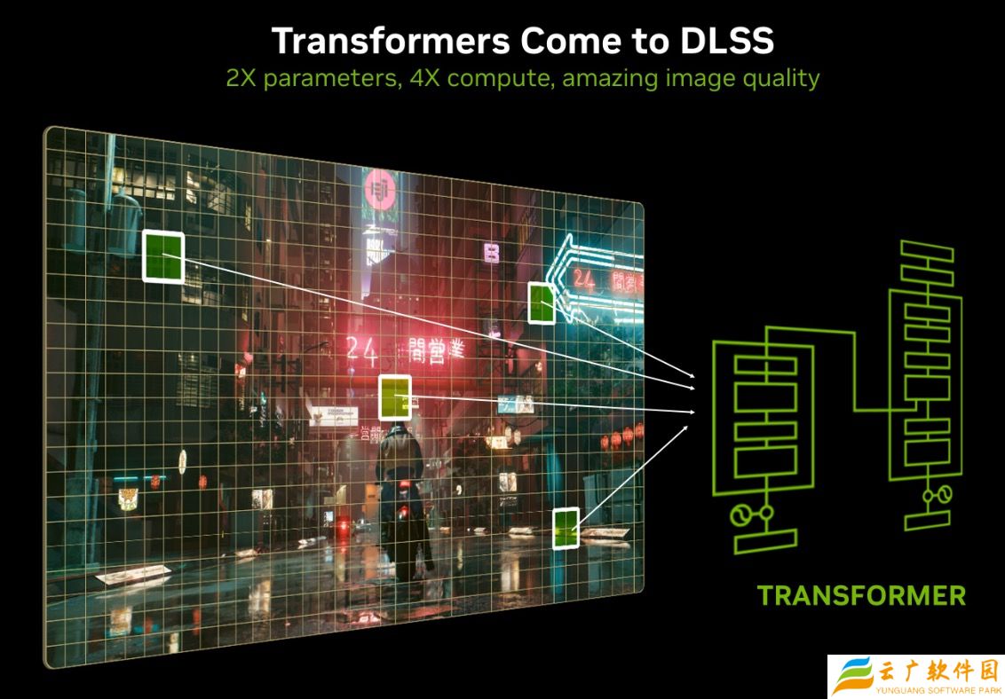 DLSS 4 技术还带来了模型架构的重大升级,DLSS 光线重建、DLSS 超分辨率和 DLAA 特性均由首个实时 Transformer 模型驱动,并用来提升生成像素的质量,它支持通过自注意力操作评估整个帧几多个帧中每个像素的重要程度,更好理解场景关系,让生成的像素具有更好稳定性、更少的伪影、更丰富的运动细节和平滑边缘。