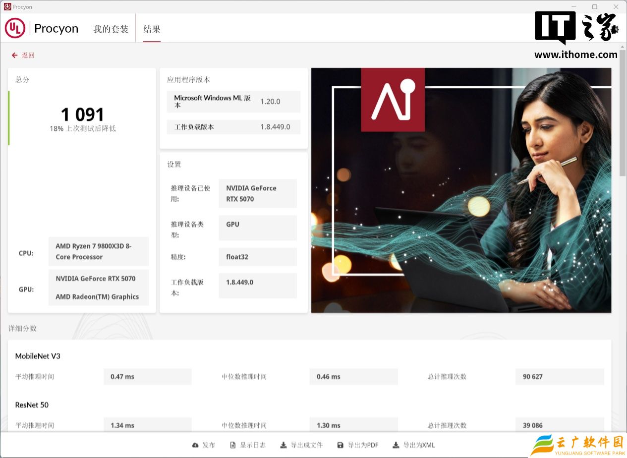 在 UL Procyon AI 推理性能测试项目中的 Microsoft Windows ML 版本测试中: