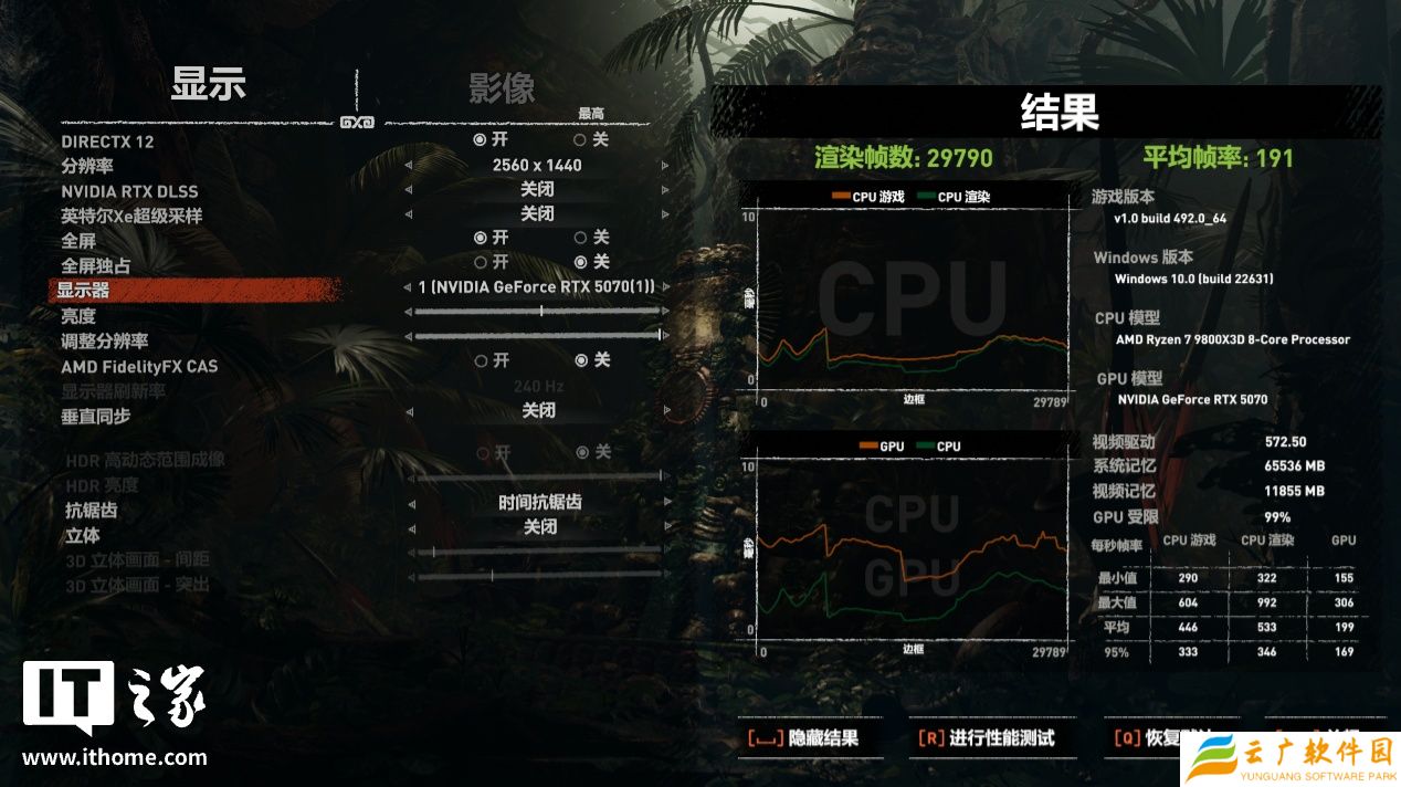 RTX 5070 在 2K 分辨率 + 最高画质下,游戏平均帧数为 191 帧,1% Low 帧 143 帧;