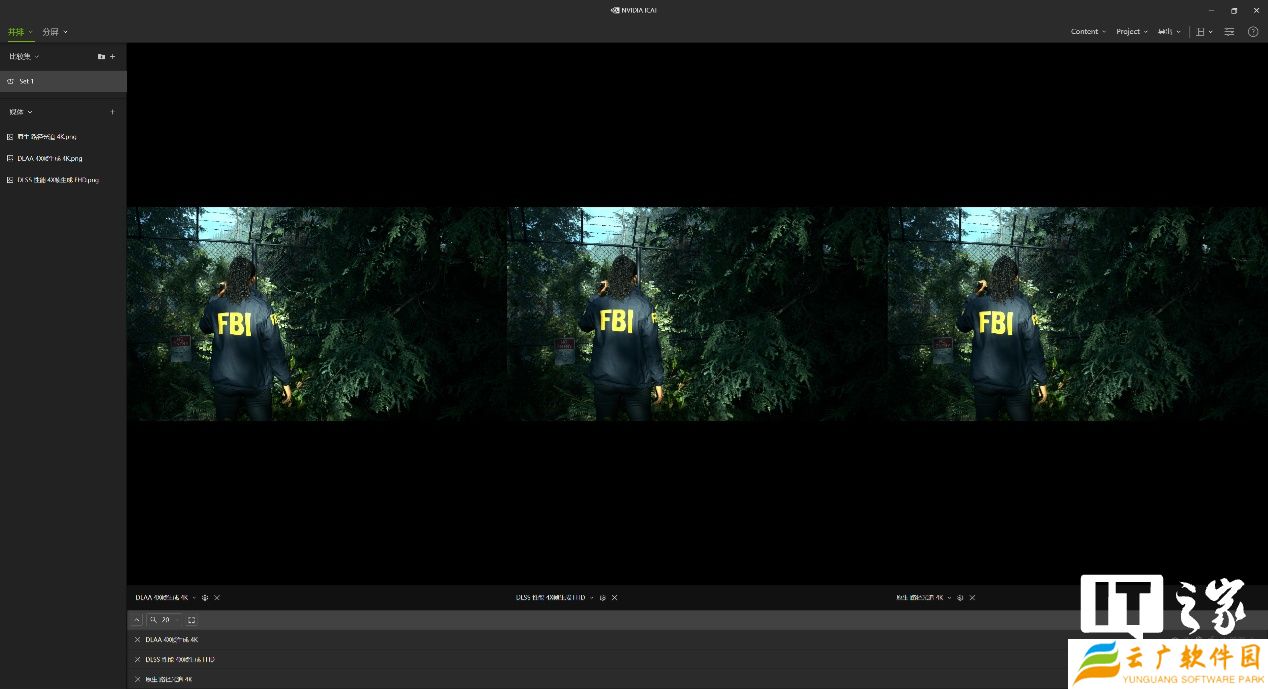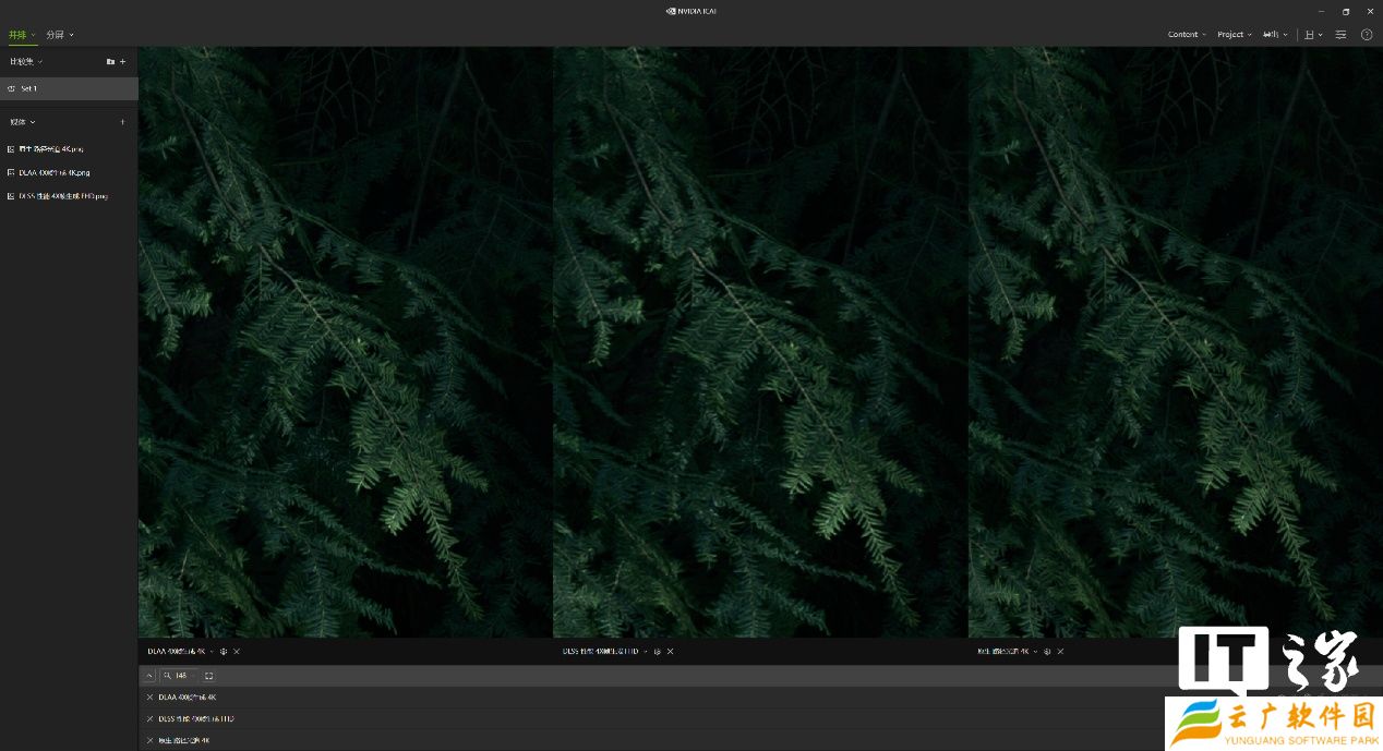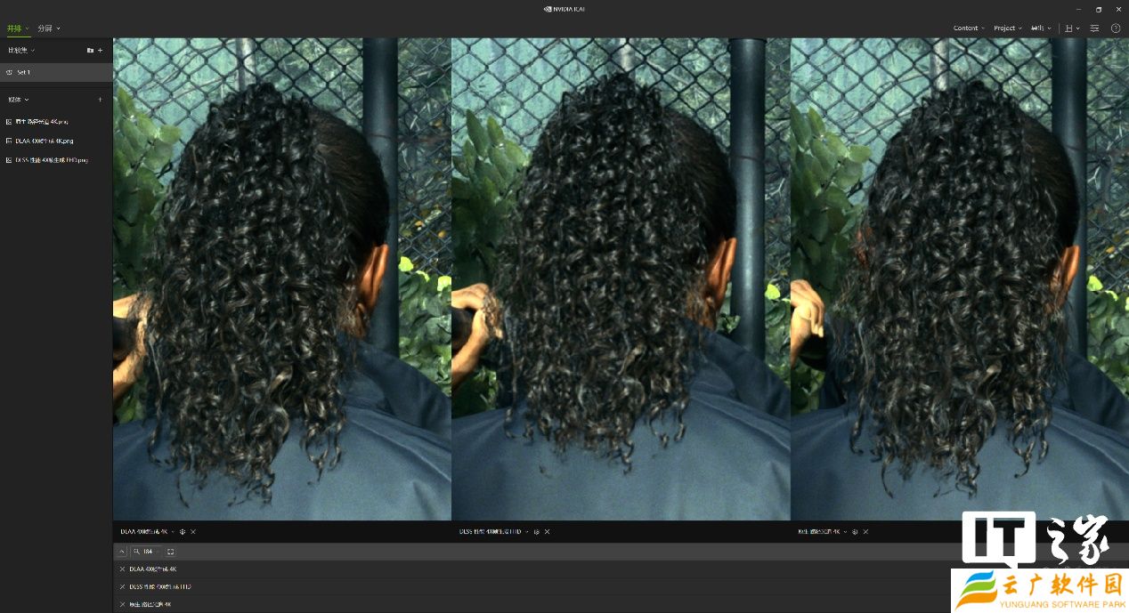 然后通过 NVIDIA ICAT 工具进行比较,在不放大的情况下 3 者根本看不出区别,所以我们挑选了 3 处细节进行放大对比。