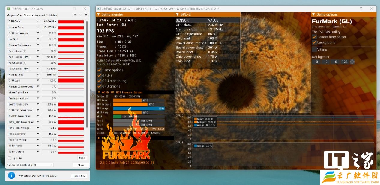 首先是烤机环节,NVIDIA GeForce RTX 5070 显卡在甜甜圈单烤 20 分钟后,GPU 功耗稳定在了 250W,GPU 主频比较保守只有 2385MHz,而 GPU 温度则是 76.7℃。对比 NVIDIA GeForce RTX 4070 的烤机表现来看,功耗和温度均有一定程度增加。不过考虑到 NVIDIA GeForce RTX 5070 显卡的整体尺寸缩小了不少,更加轻薄,温度略高一些,问题不大。