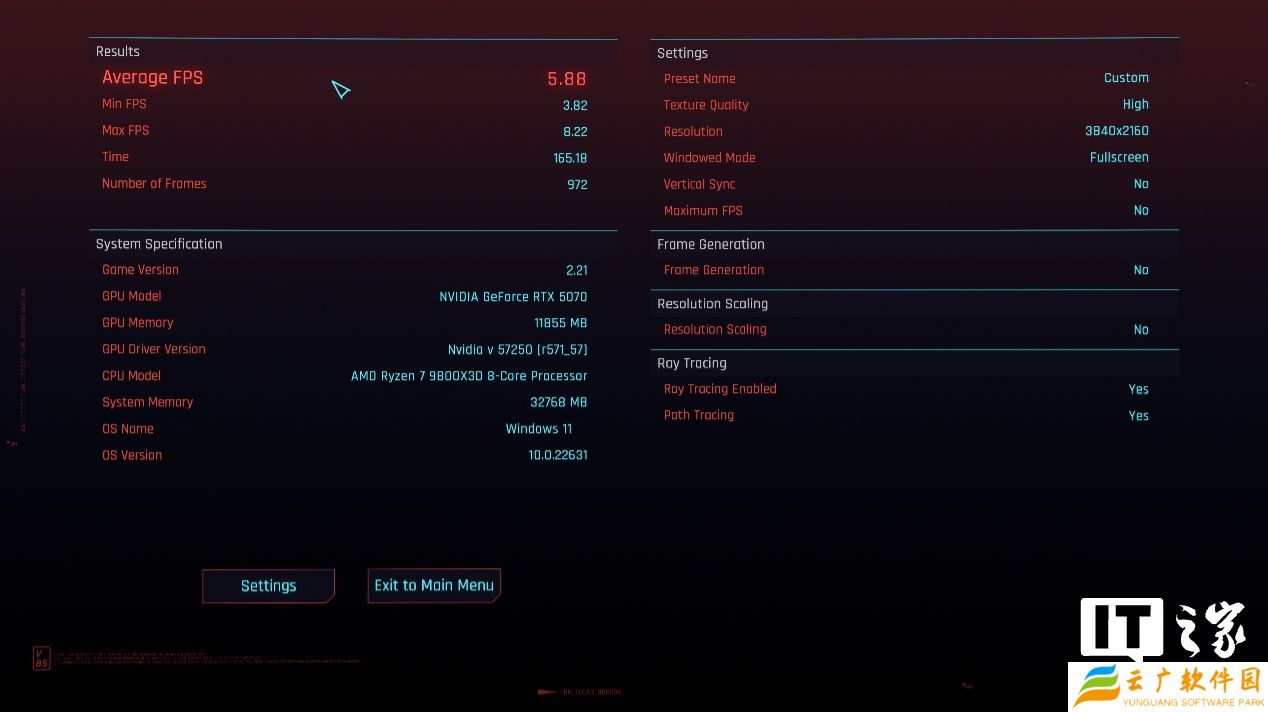《赛博朋克:2077》作为首批支持 DLSS 4 技术最完善的游戏之一,如果在 4K 分辨率下开启光追,但不开启 DLSS 和帧生成选项,那么: