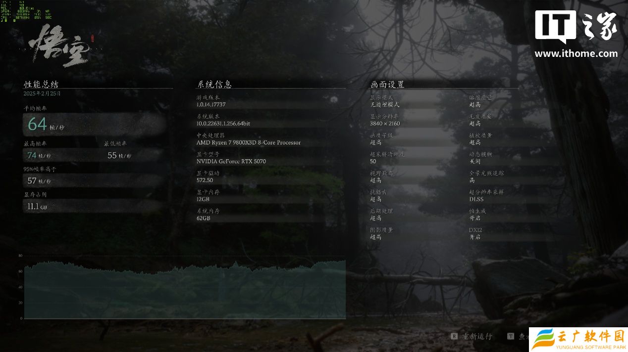 RTX 5070 在 4K 分辨率 + 超高画质 + 50% 超采样分辨率 + 高全景光追 + 帧生成下,游戏平均帧数为 64 帧,1% Low 帧 51 帧;