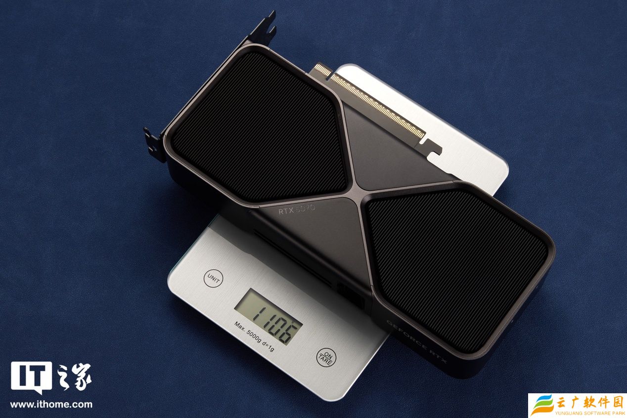 显卡尺寸方面经过本站实测,三围分别是 244*98*40mm(不含挡片),上秤重量为 1.1kg。NVIDIA GeForce RTX 4070 公版卡(1.008kg)重量基本保持一致,尺寸则更小巧一些。