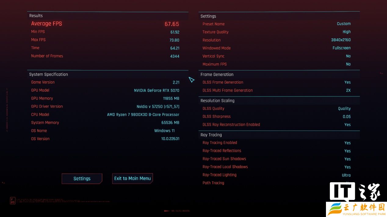 RTX 4070 在 4K 分辨率 + 极致画质 + 开启光追 + DLSS 抗锯齿下,游戏平均帧数为 66 帧,1% Low 帧 57 帧;