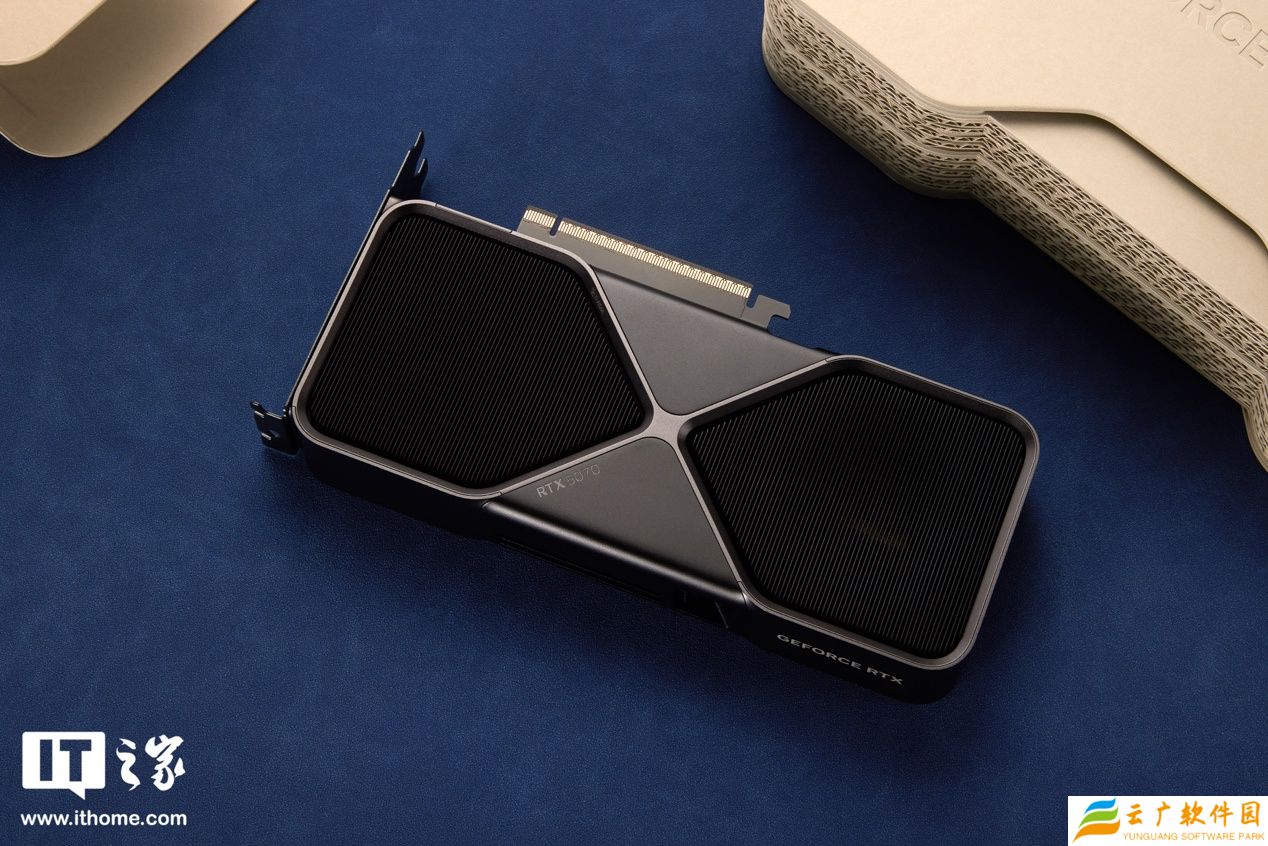 显卡另一面对应着双风扇的位置,布满了非常密集的竖向散热鳍片,便于散热。X 造型“沙漏”包边的中间三角形边缘部分做了圆润的弧形过渡,让握持的手感更加柔和。其中一个三角区域印着小小的 RTX 5070 标志。