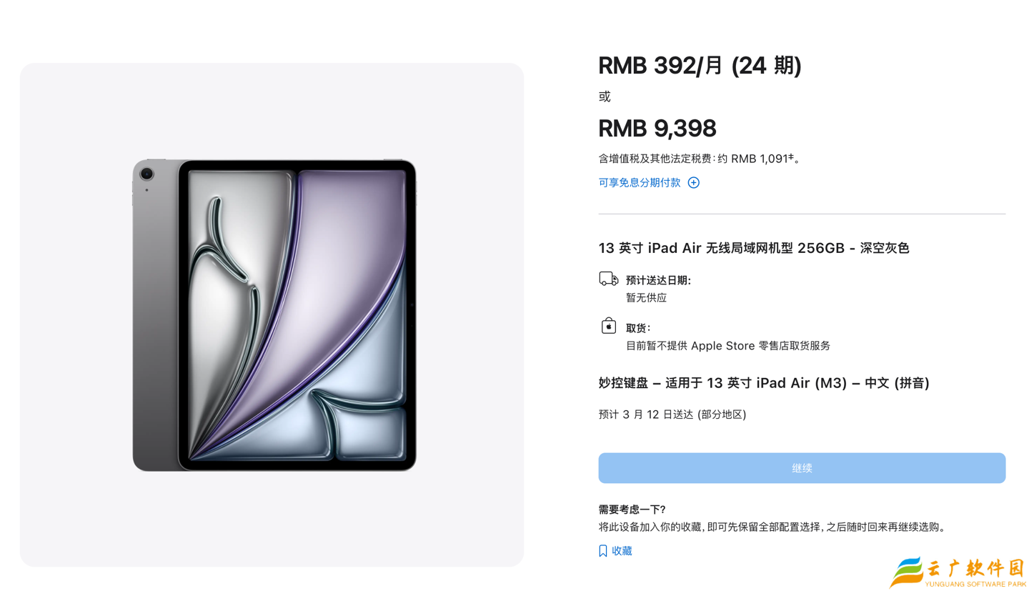 如果还需键盘,13 英寸 M3iPad Air256G 版 + 妙控键盘套装官方现售 9398 元,差价 3199 元。