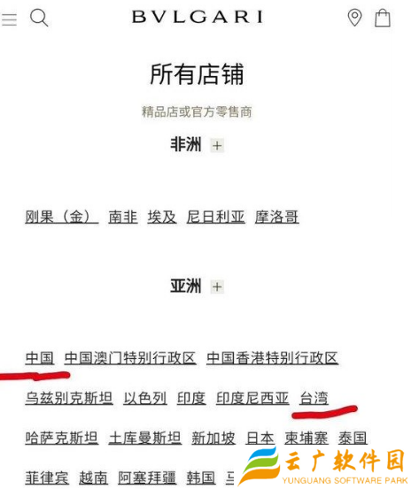 图中为宝格丽官方发货地址,有把台湾作为国家分类区分。