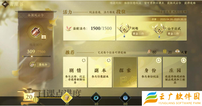 1、在游戏主页面右上方点击“青崖书”图标,通过完成该页面的任务和活动,累计2500的风云令后即可获得委托令。